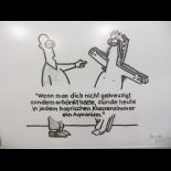 Satiriker liefern die hĂ€sslichsten Wahrheiten, die andere nicht aussprechen, im schönsten Kleid und versiegeln sie mit Witz und Lachen; stopfen die Socken der Moral mit Verspottung. Somit ist Satire die edelste Paarung von Meinungsfreiheit mit Ăsthetik. Satire darf und kann alles sagen, was der Mensch nur denken kann und darf, um die Menschen aus ihrem Dornröschenschlaf zu wecken. Fett und zufrieden liegen die Menschen da, am giftigen Apfel der Fake News erstickt. Satire kĂŒsst sie wach mit spitzer Zunge und kitzelt ihren stumpfen Geist! Und in dieser digitalen Biedermeierzeit, in der Aberglaube und Dummheit augenscheinlich und gesetzlich institutionalisiert werden: Das christliche Kreuz an den WĂ€nden der LandratsĂ€mter, das dem Söder hoffentlich das Kreuz brechen wird, ist in den Ămtern nicht notwendig, in der Satire dafĂŒr umso mehr.